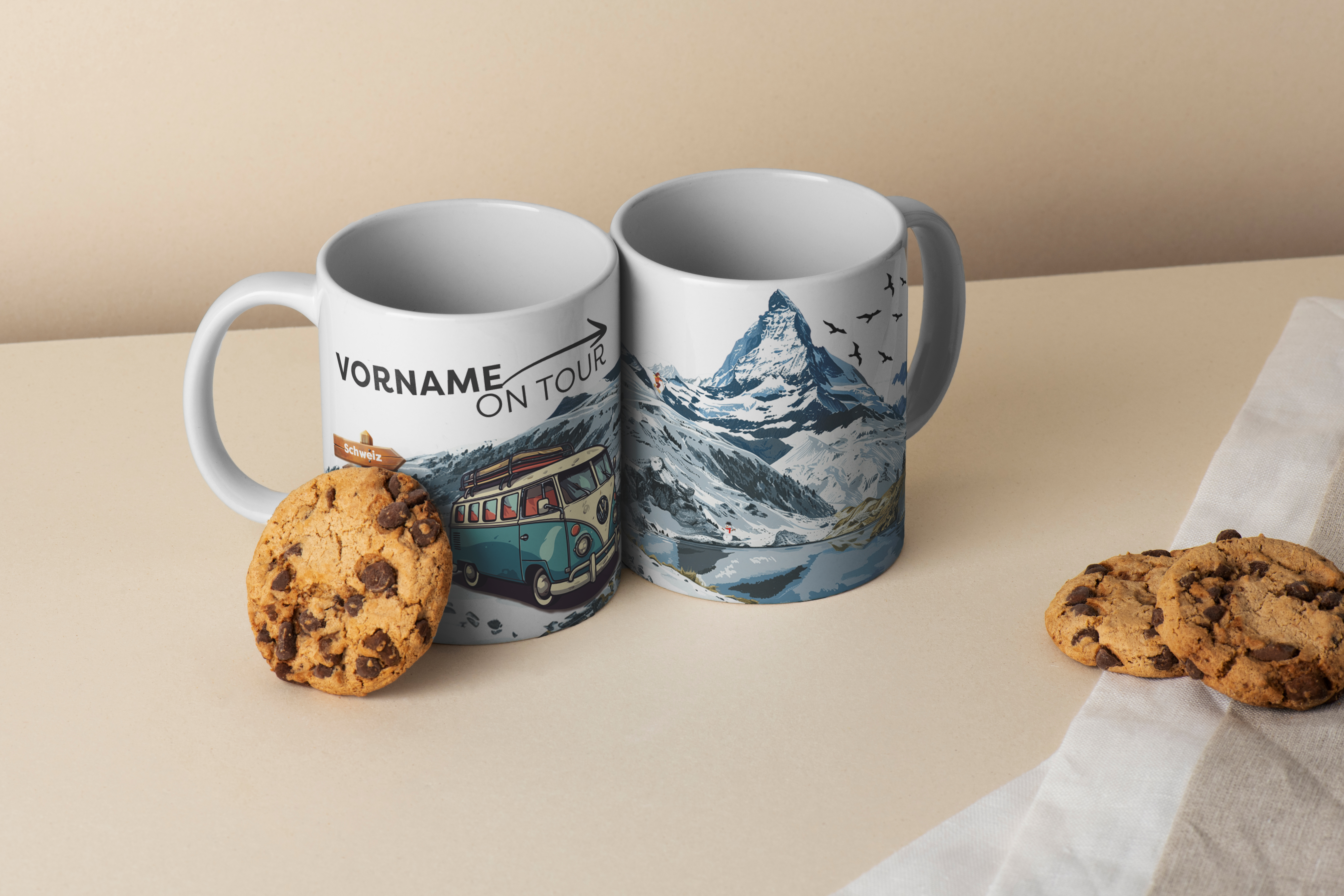 Imagine holding a cup in your hand that immediately radiates winter magic: a classic VW Bulli parked peacefully in the snow at the foot of the majestic Matterhorn. The clear, fresh mountain air and the crunching snow are almost palpable.This mug brings the feeling of freedom and winter adventures directly into your everyday life - perfect for a cozy break or the next road trip in the Alps you have in your head. Bring a piece of winter wonderland into your kitchen!