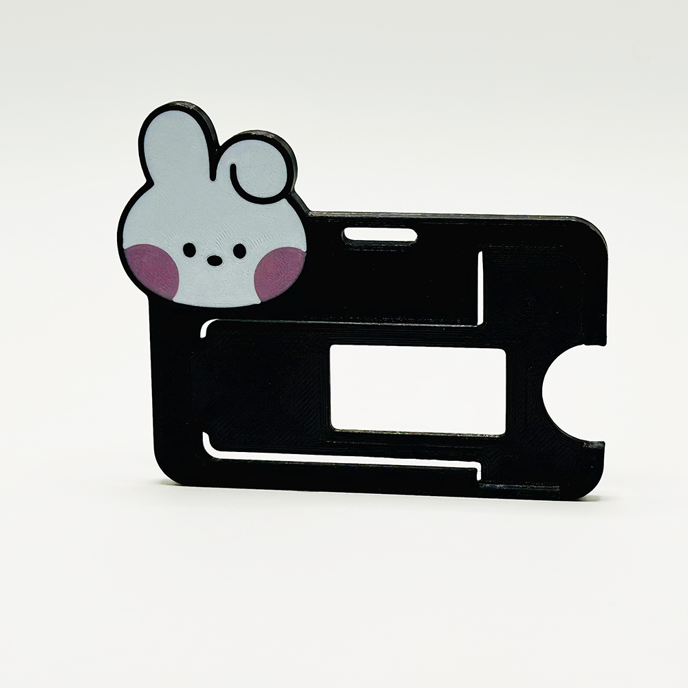 Your personal carrying frame in black with a cute rabbit face and pink cheeks.
